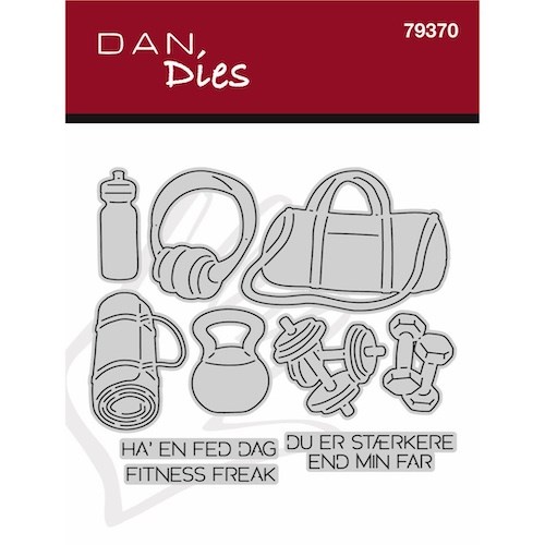 Fitness udstyr fra Dan Dies indeholer 7 dies med diverse trænings ting på. Lige fra taske og drikkedunk til headset og vægte. Derudover er der teksterne "Ha en fed dag", "Fitness freak" og "Du er stærkere end min far". Tasken måler ca. 5,5x3,7cm og headsettet måler ca. 2,8x3,4 cm