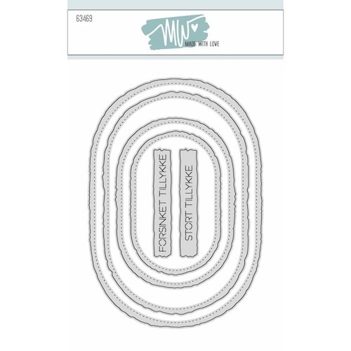 Deckle Edge Ovals fra Made With Love indeholder 4 ovaler og 2 tekster - alle med afrevne kanter. Teksterne er "Stort tillykke" og "forsinket tillykke".