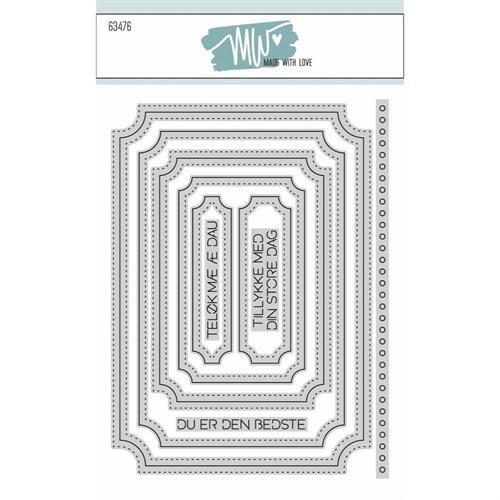 Labels 3 fra Made With Love indeholder 6 label dies, 1 kant med huller og 3 tekster. Label formen er rektangler med kvarte cirkler fjernet fra hjørnerne - en effekt der er sød at bruge for sig selv, eller kombiner den med almindelige rektangler som et ekstra lag. Der er 2 labels i A6 format og 2 i A7 format. Den største i hvert format har syning både på indersiden og ydersiden af skærelinjen, så man kan bruge den på flere måder. Teksterne er "Du er den bedste", "Tillykke med din store dag" og "Teløk mæ æ dau". Passer sammen med label rammerne fra Sketches 14.