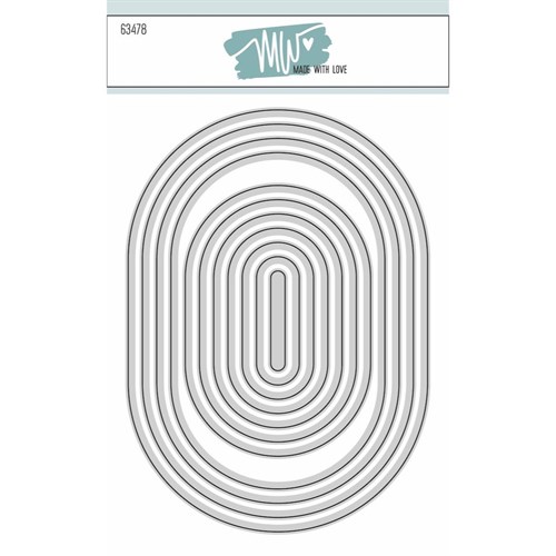 Basic Ovals 1 fra Made With Love indeholder 11 ovale dies. 4 i A6 format og 7 i A7 format. Den største A6 måler 10,5x14,8 cm og den største A7 er 6,5x9,5 cm. Kombiner med Basic Ovals 2 (63479) for at kunne lave helt tynde rammer eller lag.