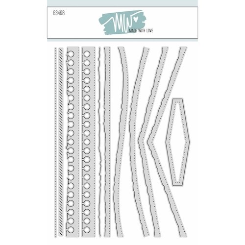 Edges fra Made With Love indeholder 11 dies - 2 effekt dies med syninger, 2 notebogs kanter, 6 afrevne kant dies med lige, buet og vinklet kanter og syninger og 1 label die (passer som lag til label i Sketches 3 (63403)).
