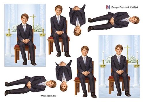 Konfirmationsdreng på stol i kirke, 3d-ark HM Design.